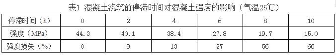 (6)在初凝時(shí)間內(nèi)的混凝土,由于氣溫較高、運(yùn)距較遠(yuǎn)、壓車時(shí)間較長等造成混凝土坍落度損失較大,可通過試驗(yàn)添加同型號(hào)的泵送劑或減水劑,但添加與原先已加的總和摻量不能超過外加劑最大摻量的20%。應(yīng)逐漸添加,先少加,摻入后,攪拌運(yùn)輸車必須快速轉(zhuǎn)動(dòng)2min左右,測定坍落度符合要求。運(yùn)到現(xiàn)場的混凝土不能立即卸料,應(yīng)快速轉(zhuǎn)動(dòng)運(yùn)輸車2min后卸料,以確保坍落度和質(zhì)量。對(duì)超過初凝時(shí)間的混凝土應(yīng)廢棄,不能再使用?;炷翝仓巴臅r(shí)間越長,混凝土強(qiáng)度損失越嚴(yán)重(如表1),應(yīng)當(dāng)引起足夠重視。