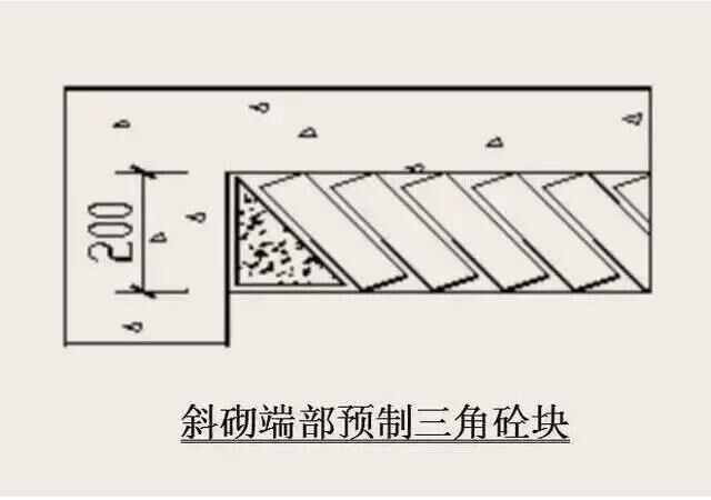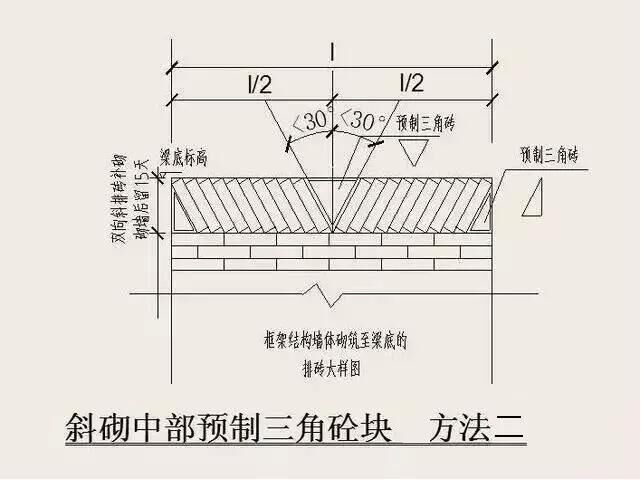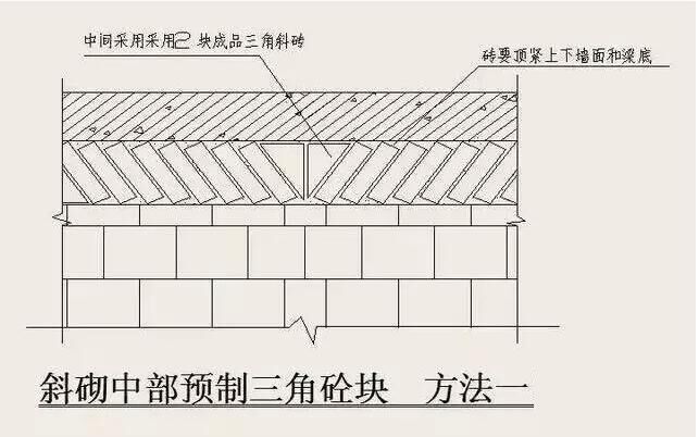 6)砌體頂部斜頂磚要求:砌到接近上層梁、板底約200mm,浮磚壓頂待下部砌體沉縮。在抹灰前(間 隔時(shí)間不少于14天),宜用實(shí)心磚斜砌擠緊,磚傾斜度為60度左右,砂漿應(yīng)飽滿,如圖所示: