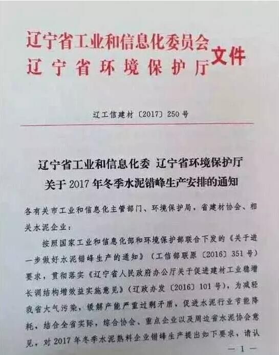 日前,遼寧省工信委和遼寧省環(huán)保廳聯(lián)合發(fā)文要求遼寧省水泥企業(yè)于今年11月開始啟動(dòng)水泥行業(yè)采暖季錯(cuò)峰停產(chǎn)計(jì)劃,除大連市以外的其他城市的全部水泥熟料生產(chǎn)企業(yè)錯(cuò)峰停產(chǎn)6個(gè)月,錯(cuò)峰生產(chǎn)自今年11月1日起停至明年春天4月末結(jié)束。