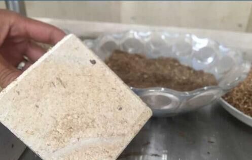 上生產(chǎn)出來的鋼鈣秸稈實心墻板已擺放得整整齊齊?!斑@些機器‘吃’進去的是秸稈,‘吐’出來的是墻板,正適合當(dāng)作建筑外墻屋面材料?!痹摴窘?jīng)理文華銀拿出了一塊墻板樣品,側(cè)切面能清晰地看到秸稈碎屑。盡管摸上去第一感覺像木頭,但用手使勁兒敲打卻能感受到足夠的硬度,“每平米墻板所含的秸稈能達到60%至80%。”