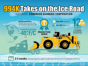 一旦機器安全到達客戶的施工現(xiàn)場,真正的樂趣就開始了。Carlos與卡特彼勒代理商芬寧加拿大分部的四名機械師合作安裝了這臺長18米的設(shè)備。Carlos非常喜歡客戶定期來到994K的安裝現(xiàn)場,客戶對在施工現(xiàn)場使用這種新型Cat裝載機的興奮勁也讓他很開心?!翱吹竭@么大的設(shè)備Dominion Diamond很興奮,他們迫不及待地希望把它派上用場?!?