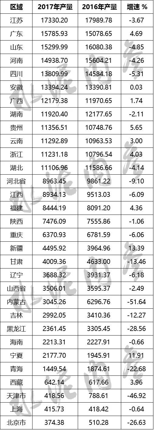 各省市水泥產量排名(單位:萬噸)