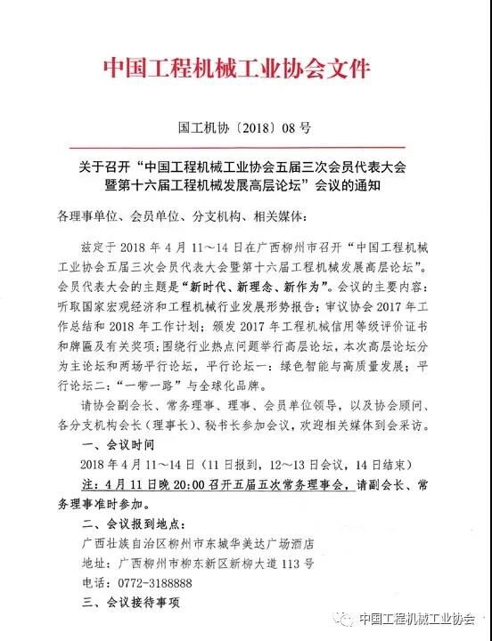中國工程機械工業(yè)協(xié)會茲定于2018年4月11~14日在廣西柳州市召開“中國工程機械工業(yè)協(xié)會五屆三次會員代表大會暨第十六屆工程機械發(fā)展高層論壇”。會員代表大會的主題是“新時代、新理念、新作為”。