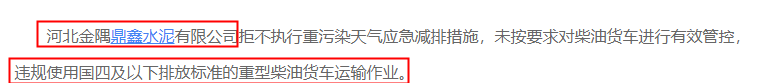 此外,今年10月河北金隅鼎鑫水泥有限公司拒不執(zhí)行重污染天氣應急減排措施,未按要求對柴油貨車進行有效管控,違規(guī)使用國四及以下排放標準的重型柴油貨車運輸作業(yè),被當?shù)丨h(huán)保部門通報。