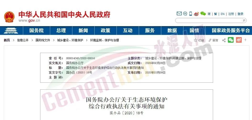 近日國(guó)務(wù)院辦公廳發(fā)布《關(guān)于生態(tài)環(huán)境保護(hù)綜合行政執(zhí)法有關(guān)事項(xiàng)的通知》在水泥行業(yè)引起強(qiáng)烈反響。此次文件對(duì)當(dāng)前水泥行業(yè)多部門重復(fù)檢查,隨意被停產(chǎn)等一些熱點(diǎn)問(wèn)題給出了明確規(guī)定。要堅(jiān)決取消不必要的執(zhí)法事項(xiàng),合并涉企檢查事項(xiàng),切實(shí)解決多頭多層重復(fù)執(zhí)法問(wèn)題,嚴(yán)格規(guī)范公正文明執(zhí)法。