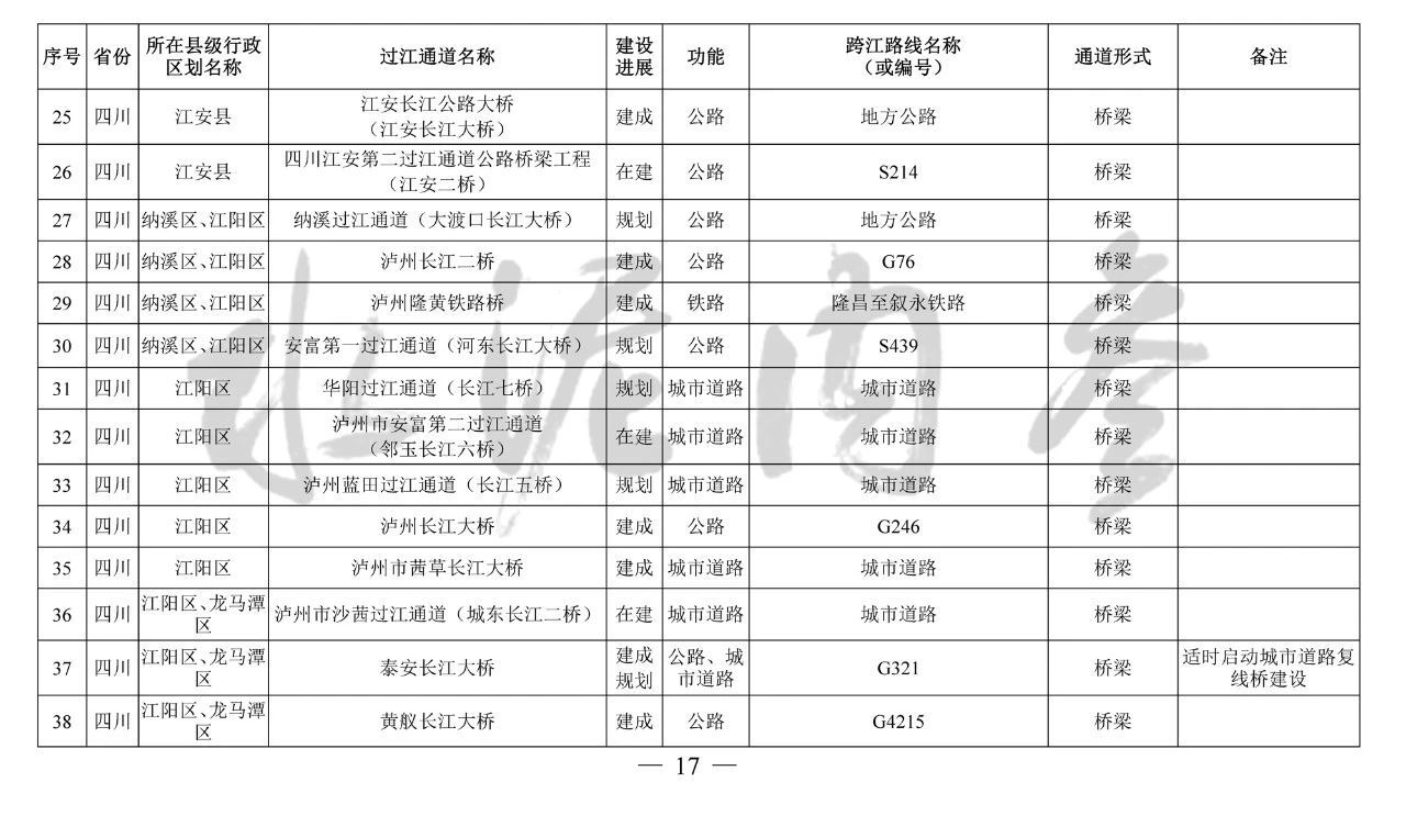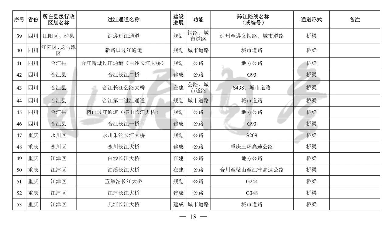 四川?。?0座):雞翅膀大橋、臨港掛弓山長江大橋、羅龍過江通道、納溪過江通道(大渡口長江大橋)、安富第一過江通道(河?xùn)|長江大橋)、瀘州藍(lán)田過江通道(長江五橋)、瀘遵過江通道、新路口過江通道、合江新城過江通道(白沙長江大橋)、榕山過江通道(榕山長江大橋)