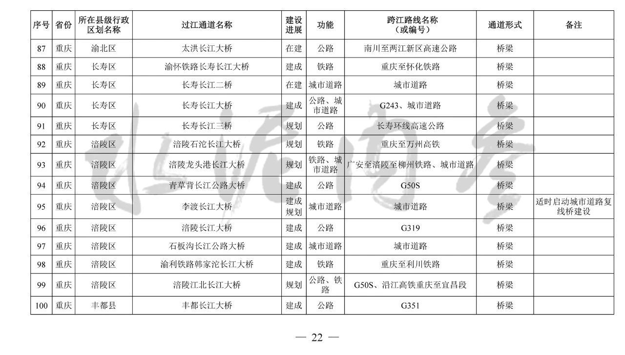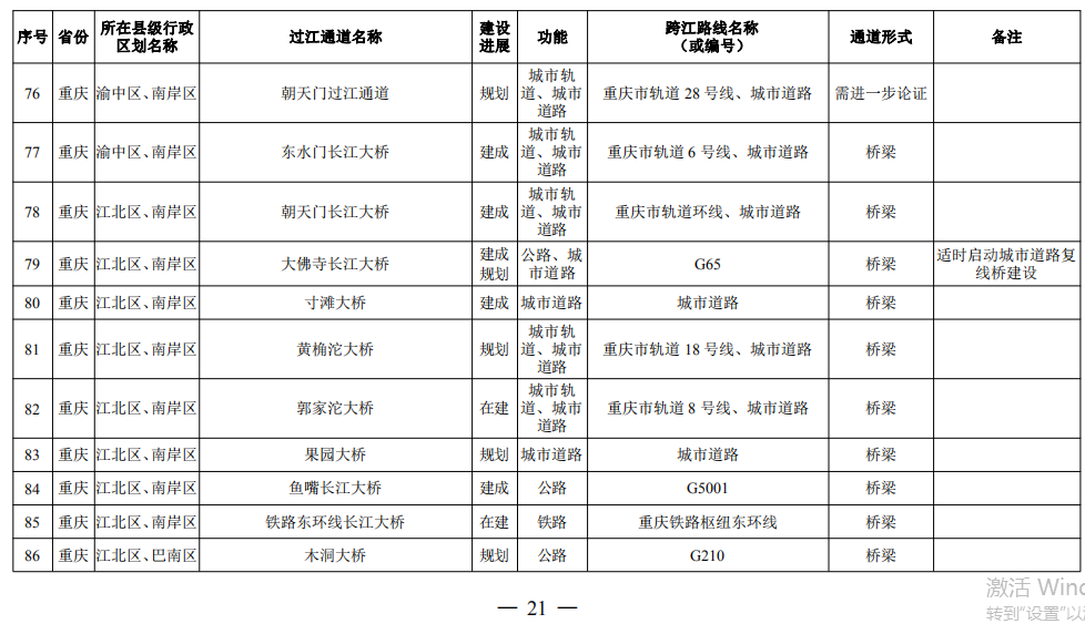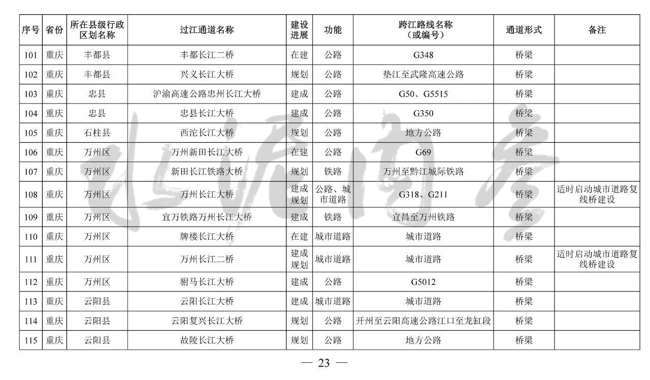 重慶市(17座):市域(郊)鐵路跳蹬至江津線長江大橋、西彭長江大橋(支坪長江大橋)、小南海長江大橋、中壩過江通道、黃桷坪長江大橋、軌道27號線過江通道、重慶至黔江鐵路過江通道、黃桷沱大橋、長壽長江三橋、涪陵石沱長江大橋、涪陵龍頭港長江大橋、涪陵江北長江大橋、興義長江大橋、西沱長江大橋、云陽復(fù)興長江大橋、奉節(jié)二橋、巫山長江二橋