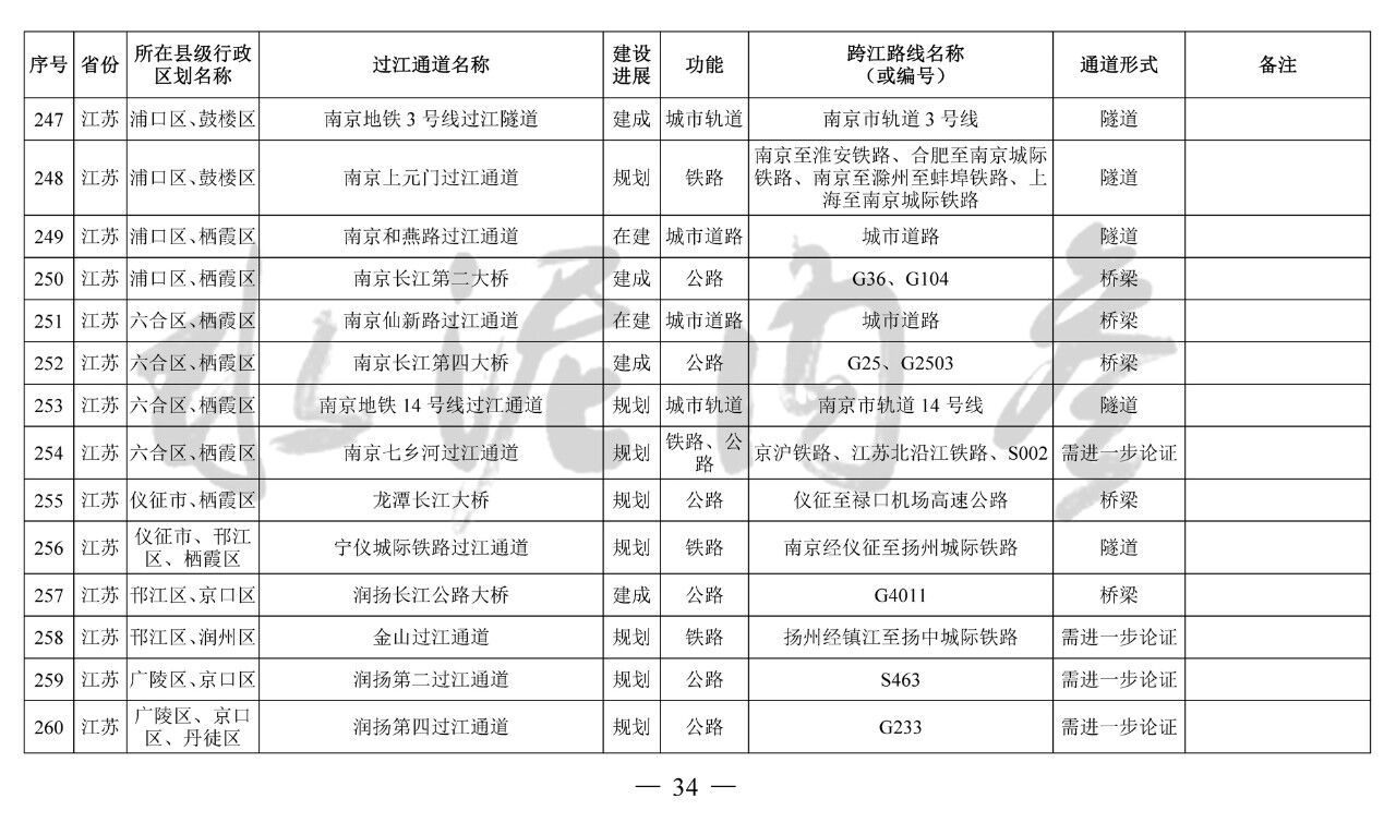 江蘇省(13座):錦文路過江通道、南京地鐵4號線過江通道、南京市域快速軌道過江通道、南京上元門過江通道、南京七鄉(xiāng)河過江通道、龍?zhí)堕L江大橋、寧儀城際鐵路過江通道、潤揚(yáng)第二過江通道、江陰第二過江通道、江陰第三過江通道、張皋過江通道、蘇通第二過江通道、海太過江通道