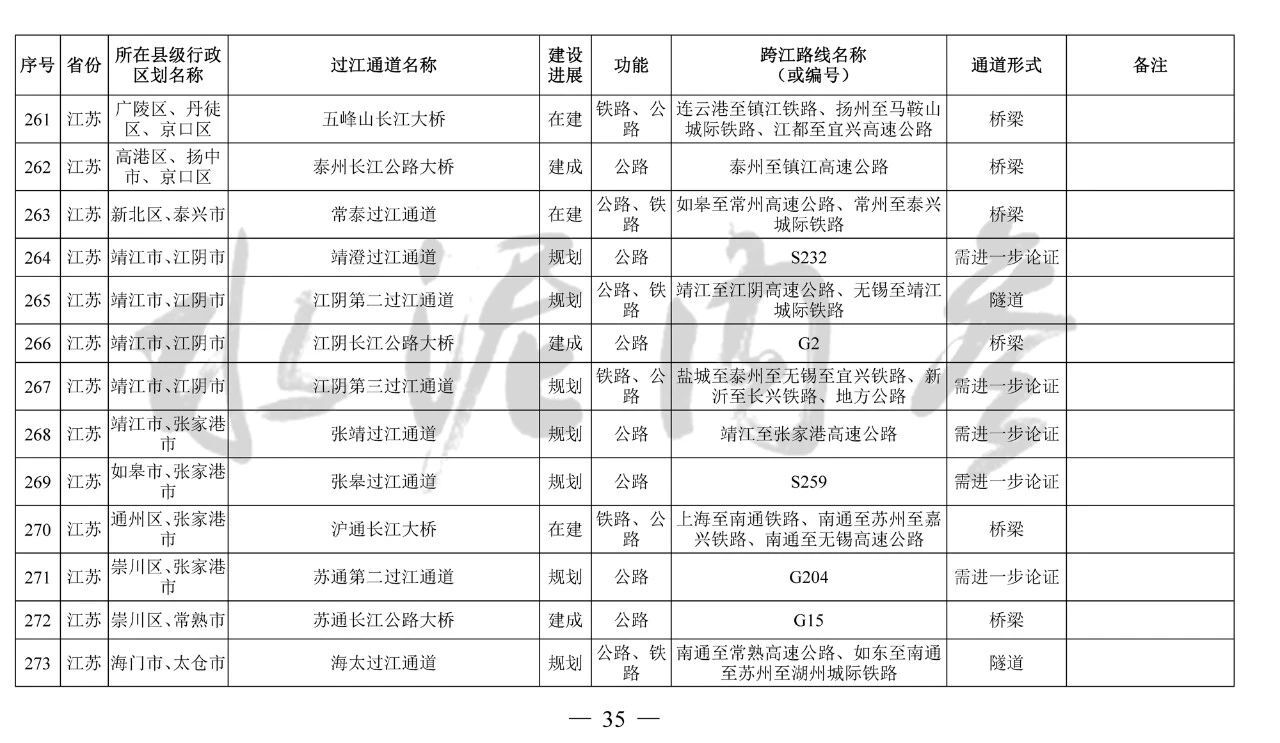 其中,到2035年規(guī)劃布局長江干線過江通道276座,其中四川省45座、重慶市75座、湖北省69座、安徽省32座、江蘇省41座、上海市3座、滇川界1座、鄂湘界2座、鄂贛界6座、贛皖界2座。