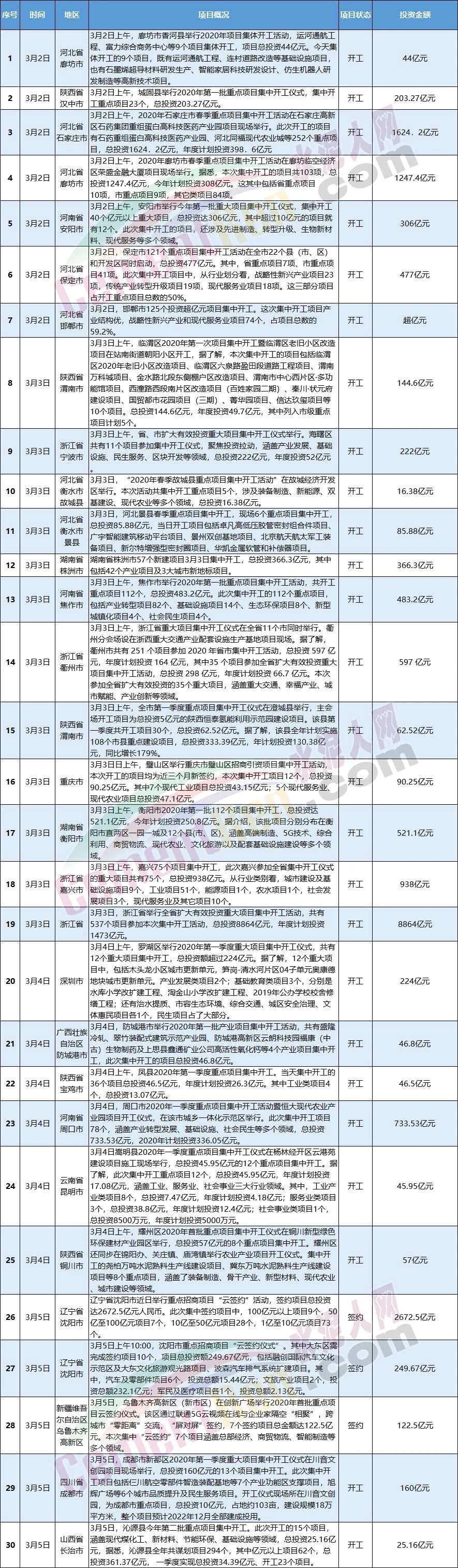 3月全國(guó)新開(kāi)工和簽約項(xiàng)目一覽表