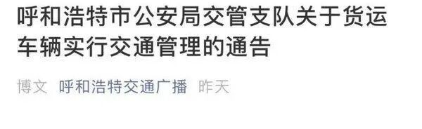 日前,呼和浩特市公安局交管支隊(duì)發(fā)布通告表示:6月28日起,對貨運(yùn)車輛采取交通管理措施。
