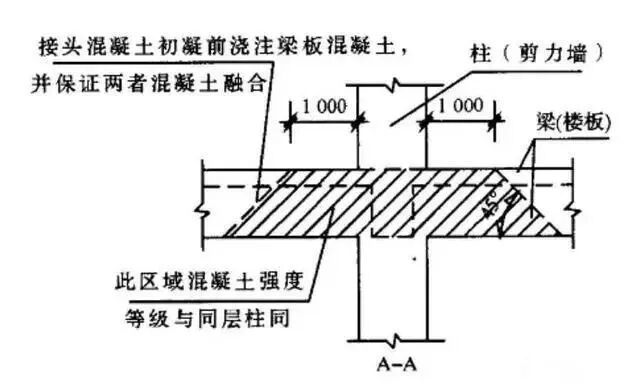 5、節(jié)點處的混凝土實行“先高后低”的澆搗原則,即先澆高強度等級混凝土,后澆低強度等級混凝土,嚴格控制在先澆筑混凝土初凝前繼續(xù)澆搗梁板的混凝土,事先做好技術(shù)交底和準備工作。