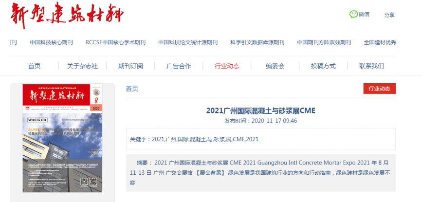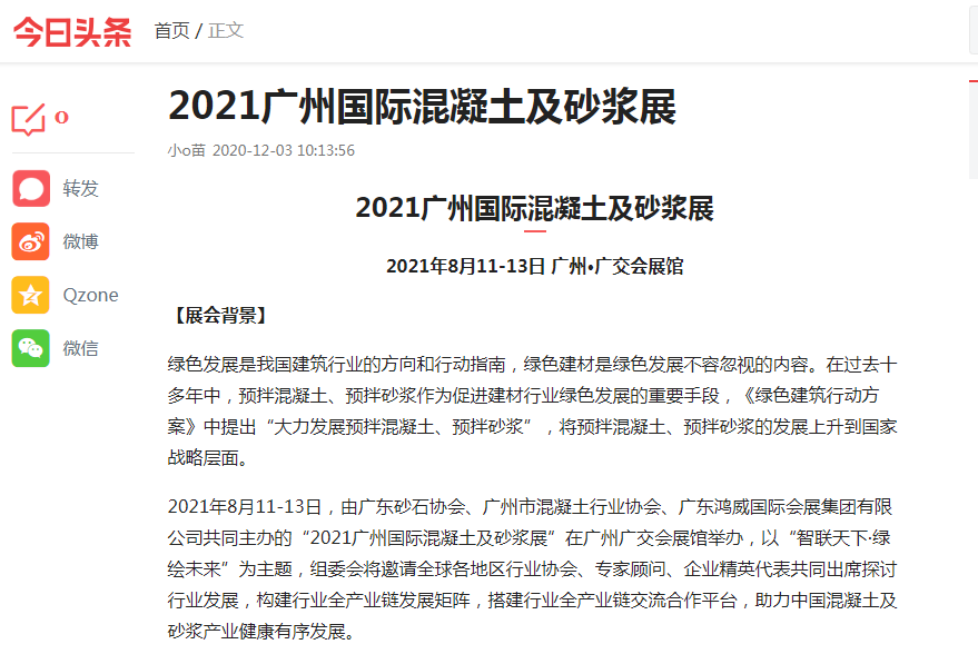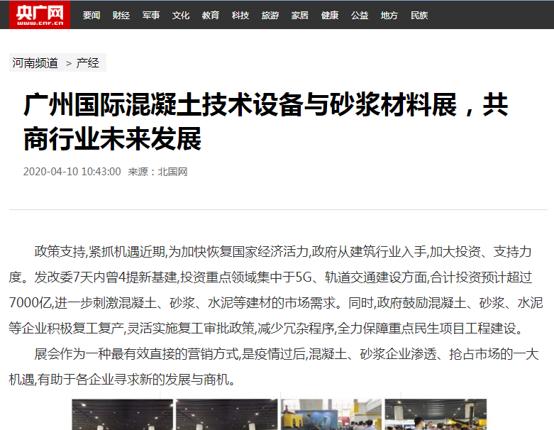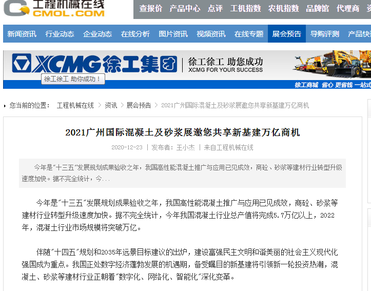 在此,小編就不一一列舉了,再次衷心感謝各大媒體對(duì)2021廣州國(guó)際混凝土及砂漿展的大力宣傳,為各地的混凝土、砂漿產(chǎn)品、設(shè)備代理商、經(jīng)銷商、承包商、進(jìn)出口貿(mào)易商等業(yè)內(nèi)人士等提供全面了解展會(huì)的平臺(tái)!
