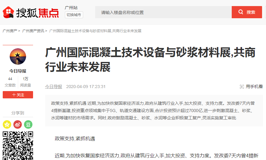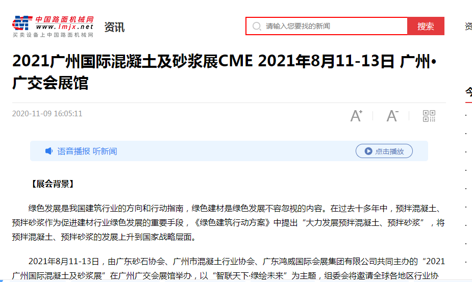 廣州國(guó)際混凝土及砂漿展已于2020年成功舉辦,自項(xiàng)目立項(xiàng)以來(lái),得到多方媒體的關(guān)注和報(bào)道。據(jù)統(tǒng)計(jì),2020-2021年度,騰訊視頻、愛(ài)奇藝、土豆網(wǎng)、優(yōu)酷視頻等電視媒體,網(wǎng)易房產(chǎn)、新浪家居、廣州搜狐焦點(diǎn)、騰訊網(wǎng)、中國(guó)數(shù)字經(jīng)濟(jì)網(wǎng)、央廣網(wǎng)、360慧聰網(wǎng)、南方網(wǎng)、北方網(wǎng)、羊城晚報(bào)、廣州日?qǐng)?bào)、新浪網(wǎng)、新京報(bào)、21世紀(jì)經(jīng)濟(jì)報(bào)道、東方網(wǎng)、光明網(wǎng)、中國(guó)商業(yè)新聞網(wǎng)、焦點(diǎn)中國(guó)網(wǎng)等主流媒體,抖音、快手、西瓜視頻、今日頭條、百家號(hào)、火山小視頻等視頻媒體和廣東建設(shè)報(bào)、中國(guó)路面機(jī)械網(wǎng)、新型砂漿網(wǎng)、世界機(jī)械網(wǎng)、工程機(jī)械在線、攪拌設(shè)備網(wǎng)、中國(guó)保溫砂漿網(wǎng)等行業(yè)媒體,以及《混凝土雜志》、《砼時(shí)代》等雜志媒體均對(duì)展會(huì)給予高度關(guān)注,積極宣傳展會(huì)動(dòng)態(tài)與資訊。感謝各行業(yè)媒體、主流媒體、視頻媒體、雜志的大力支持與高度認(rèn)可。