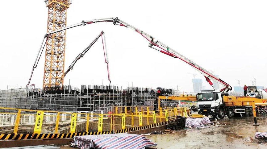 此次底板澆筑的混凝強(qiáng)度等級(jí)達(dá)C50P10,屬于高強(qiáng)度混凝土,其配合比更是屬于施工方“量身定制”,混凝土性能提升的同時(shí)也給泵車施工帶來(lái)了巨大的壓力。
