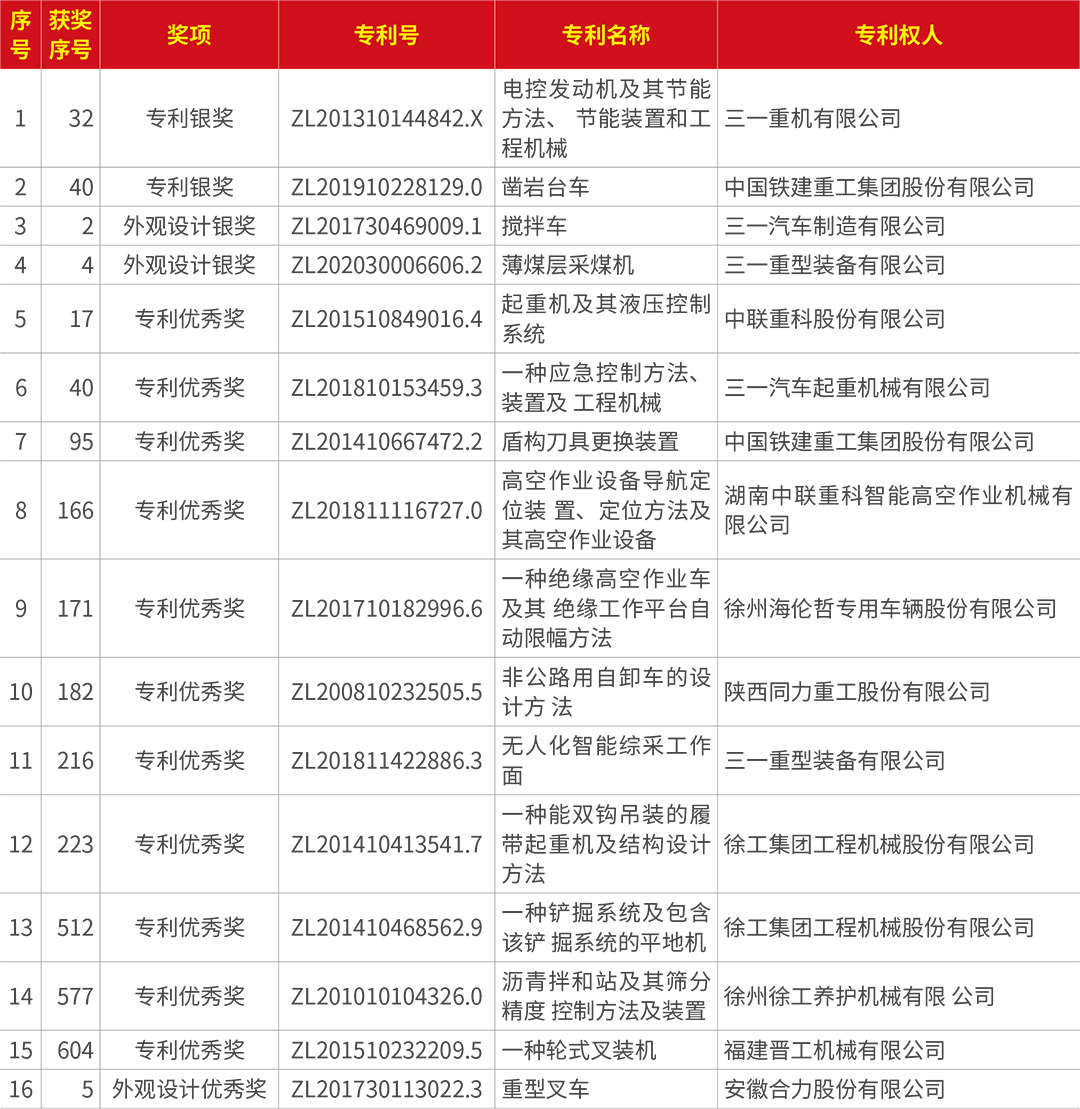本屆評(píng)選活動(dòng)中,中國(guó)工程機(jī)械行業(yè)共有十六項(xiàng)專(zhuān)利榮獲“中國(guó)專(zhuān)利獎(jiǎng)”,其中兩項(xiàng)獲專(zhuān)利銀獎(jiǎng),兩項(xiàng)獲外觀設(shè)計(jì)銀獎(jiǎng),十一項(xiàng)獲專(zhuān)利優(yōu)秀獎(jiǎng),一項(xiàng)獲外觀設(shè)計(jì)優(yōu)秀獎(jiǎng)。
