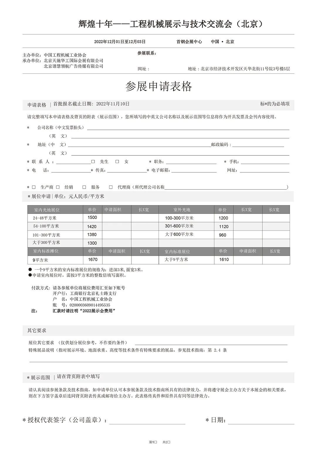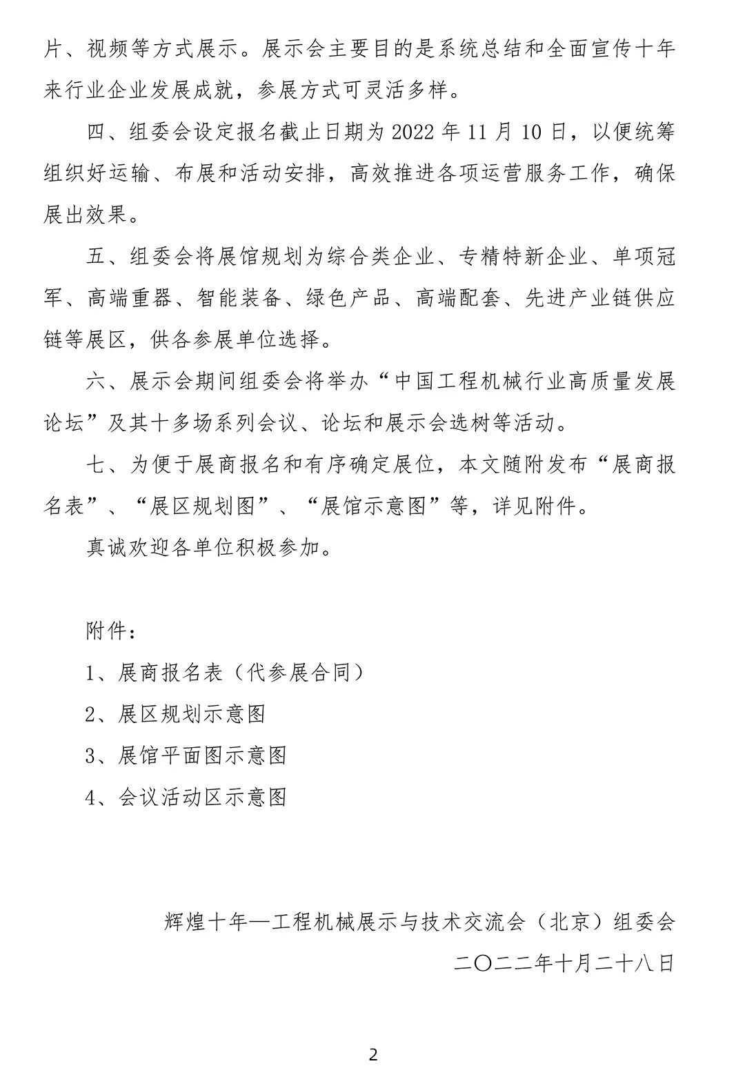 自協(xié)會(huì)發(fā)布舉辦“輝煌十年——工程機(jī)械展示與技術(shù)交流會(huì)(北京)”(以下簡(jiǎn)稱“展示會(huì)”)通知后,得到了各參展單位的快速響應(yīng)和積極支持,有的已經(jīng)報(bào)名大面積參展,有的正在履行審批程序或來電表示參加展出,組委會(huì)深表衷心感謝!為及時(shí)傳遞展會(huì)信息,服務(wù)好廣大展商,辦好本次展示會(huì),現(xiàn)向廣大展商正式發(fā)出邀請(qǐng),并將有關(guān)展示會(huì)方案說明如下:一、為充分展示黨的十八大以來工程機(jī)械行業(yè)各領(lǐng)域取得的發(fā)展成就,協(xié)會(huì)研究決定召開本次展示會(huì),邀請(qǐng)廣大協(xié)會(huì)會(huì)員和產(chǎn)業(yè)鏈上下游企業(yè)參展,共同分享企業(yè)發(fā)展成就和謀劃行業(yè)美好未來。二、展示會(huì)于2022年12月1日至3日在北京冬奧會(huì)滑雪大跳臺(tái)項(xiàng)目舉辦地——北京首鋼會(huì)展中心舉辦。屆時(shí)協(xié)會(huì)將邀請(qǐng)政府部門、相關(guān)用戶、媒體朋友和廣大觀眾到展示會(huì)現(xiàn)場(chǎng)參觀交流。12月3日(周六)實(shí)施社會(huì)公眾開放日,讓社會(huì)觀眾充分體驗(yàn)工程機(jī)械發(fā)展魅力。三、北京首鋼會(huì)展中心適合舉辦室內(nèi)高品質(zhì)展示會(huì),室外面積有限,而且適合承重較輕的產(chǎn)品展出。組委會(huì)初步規(guī)劃總展出面積2萬平米左右,希望各參展企業(yè)提供產(chǎn)業(yè)鏈上下游的先進(jìn)技術(shù)產(chǎn)品和高端裝備進(jìn)行展出,大型設(shè)備和示范工程應(yīng)用等可通過模型、圖片、視頻等方式展示。展示會(huì)主要目的是系統(tǒng)總結(jié)和全面宣傳十年來行業(yè)企業(yè)發(fā)展成就,參展方式可靈活多樣。四、組委會(huì)設(shè)定報(bào)名截止日期為2022年11月10日,以便統(tǒng)籌組織好運(yùn)輸、布展和活動(dòng)安排,高效推進(jìn)各項(xiàng)運(yùn)營(yíng)服務(wù)工作,確保展出效果。五、組委會(huì)將展館規(guī)劃為綜合類企業(yè)、專精特新企業(yè)、單項(xiàng)冠軍、高端重器、智能裝備、綠色產(chǎn)品、高端配套、先進(jìn)產(chǎn)業(yè)鏈供應(yīng)鏈等展區(qū),供各參展單位選擇。六、展示會(huì)期間組委會(huì)將舉辦“中國(guó)工程機(jī)械行業(yè)高質(zhì)量發(fā)展論壇”及其十多場(chǎng)系列會(huì)議、論壇和展示會(huì)選樹等活動(dòng)。七、為便于展商報(bào)名和有序確定展位,本文隨附發(fā)布“展商報(bào)名表”、“展區(qū)規(guī)劃圖”、“展館示意圖”等,詳見附件。4、會(huì)議活動(dòng)區(qū)示意圖