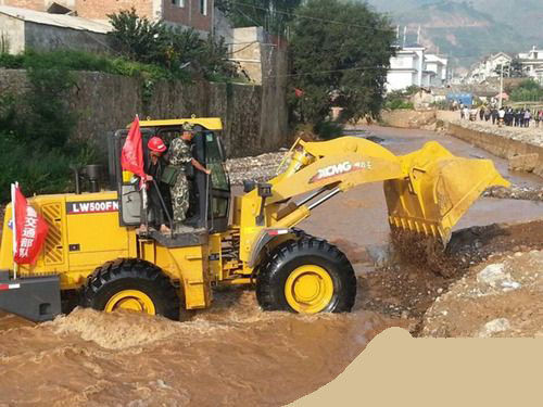 徐工救援隊員早已為車輛做好了一切前期準(zhǔn)備,按照指揮部安排,此臺徐工LW500FN裝載機參與清理災(zāi)區(qū)因塌方被堵塞的河道,并在河道中進行鋪設(shè)快速通道工作,從河道中央開出一條水上救援之路。至上午11點,徐工裝載機高效出色地順利完成了任務(wù),不僅排除了水災(zāi)隱患,更在河道中修出一條“生命線”,使后續(xù)救護車、武警車等救援車輛可以通過這條簡易通道直抵震中,為被困被埋群眾在72小時黃金救援時間內(nèi)獲救爭取到了更多時間。