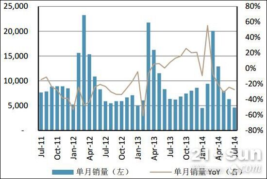 瑞銀表示,行業(yè)整體景氣度并未好轉,下滑之勢未改。2013年4月開始,土方機械單月銷量增速由負轉正,其中挖機銷量在2013年四季度實現(xiàn)了超過20%的增長,裝載機在8月后亦實現(xiàn)了超過15%的月均銷量增長。但進入2014年以來,由于房地產(chǎn)銷售及新開工不佳,2014年3月,挖掘機和裝載機銷量分別下滑8%和4%,結束了11個月的正增長。此后4-7月,跌幅持續(xù)擴大,其中7月挖機銷量下降27%,裝載機銷量下滑20%。