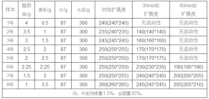 筆者將通過脂肪族與萘系復配,探討與淮南“海螺牌”水泥的適應性實驗,對比兩者的優(yōu)略,從不同的比例中找出效果理想且經(jīng)濟實用的最優(yōu)組合。本次實驗所用的淮南“海螺牌”水泥的熟料使用新型干法旋窯生產(chǎn)P.O42.5普通硅酸鹽水泥,其中三氧化硫含量為2.09%;氧化鎂含量為1.91%;氯離子含量為0.016%;混合材品種為碎屑+煤矸石,摻量12.53%;石膏為脫硫石膏,摻量4.97%,水泥初凝170min,終凝220min。脂肪族為某單位生產(chǎn)的普通脂肪族外加劑,固含量為35%,減水率24%,密度1.195g/cm3。萘系為袋裝萘粉,稀釋到含固量為35%(含固量與脂肪族的相同,方便做對比實驗)。脂肪族外加劑(免加熱型)在合成過程中使用氫氧化鈉提供熱源,導致脂肪族外加劑含堿量相對較高;而萘系在合成過程中,首先加入濃硫酸磺化,在水解中和反應,因而萘系外加劑中硫酸根離子含量相對較高。
