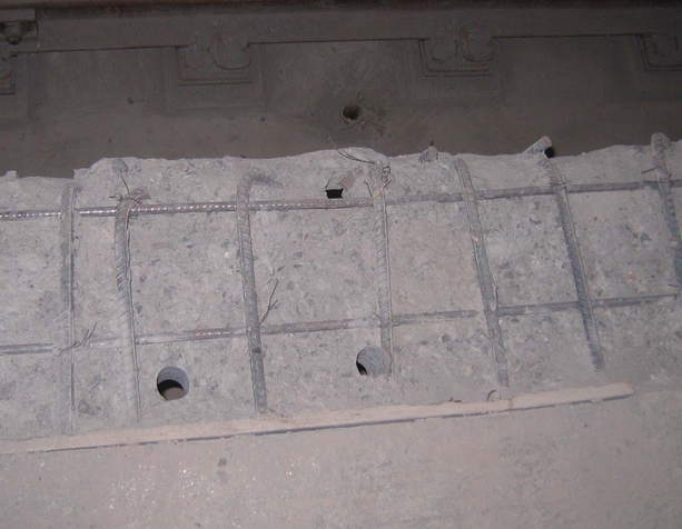 鑿除孔洞周圍松散混凝土,用高壓水沖洗干凈,立模后用高一強度等級的細石混凝土仔細澆筑搗固。