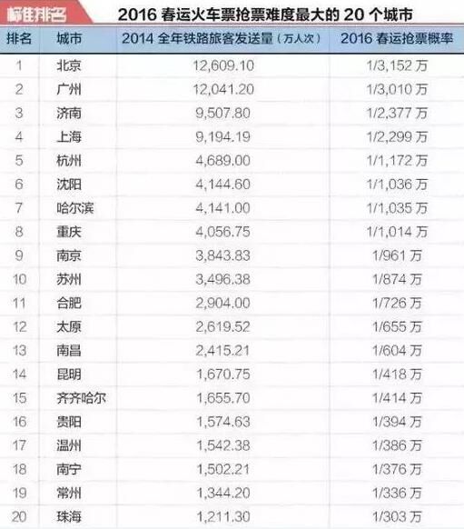 按照以上方法,標(biāo)準(zhǔn)排名在50個城市的數(shù)據(jù)基礎(chǔ)上,統(tǒng)計出了“2016春運火車票搶票難度最大的20個城市”。其中,擁有大量外來人口的北京,當(dāng)仁不讓成為了出發(fā)地最難買票的城市;打工圣地廣州,位列第二;濟(jì)南作為人口大省山東的省會,位列第三;上海和杭州緊隨其后,位列第四和第五;沈陽、哈爾濱、重慶、南京、蘇州、合肥、太原、南昌、昆明、齊齊哈爾、貴陽、溫州、南寧、常州和珠海分別進(jìn)入前20強(qiáng),入榜城市鐵路旅客發(fā)送量均超過1000萬人次。