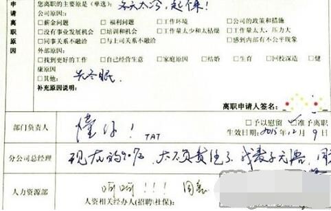 部門負責人回復:“懂你,TAT”;分公司總經(jīng)理回復:“現(xiàn)在的90后,太不負責任了,我表示無語。同意”;人力資源部回復:“呵呵?。?!同意”。