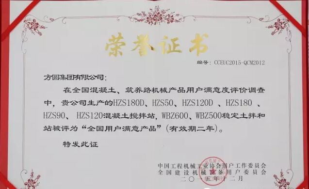 方圓集團(tuán)憑借在售后服務(wù)領(lǐng)域的突出表現(xiàn),榮獲“用戶滿意服務(wù)單位”的稱號,同時,方圓集團(tuán)生產(chǎn)的HZS180D、HZS50、HZS120D、HZS180、HZS90、HZS120型混凝土攪拌站,WBZ600、WBZ500型穩(wěn)定土拌和站被評為“全國用戶滿意產(chǎn)品”。