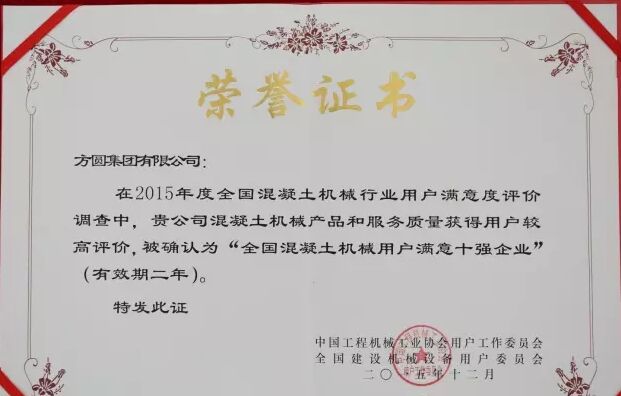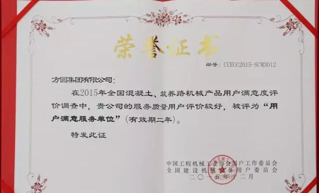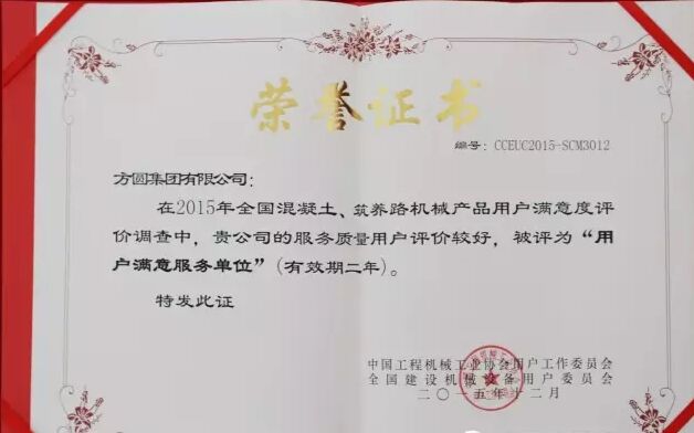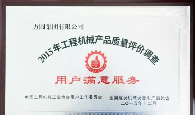 此外,因?yàn)榉綀A集團(tuán)在2015年度全國混凝土機(jī)械行業(yè)用戶滿意度評價(jià)調(diào)查中,受到廣大用戶的一致好評,被授予“全國混凝土機(jī)械用戶滿意十強(qiáng)企業(yè)”稱號。在產(chǎn)品質(zhì)量調(diào)查中,連續(xù)七次被評為“全國用戶滿意單位”。