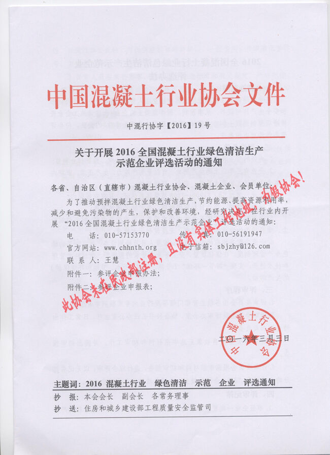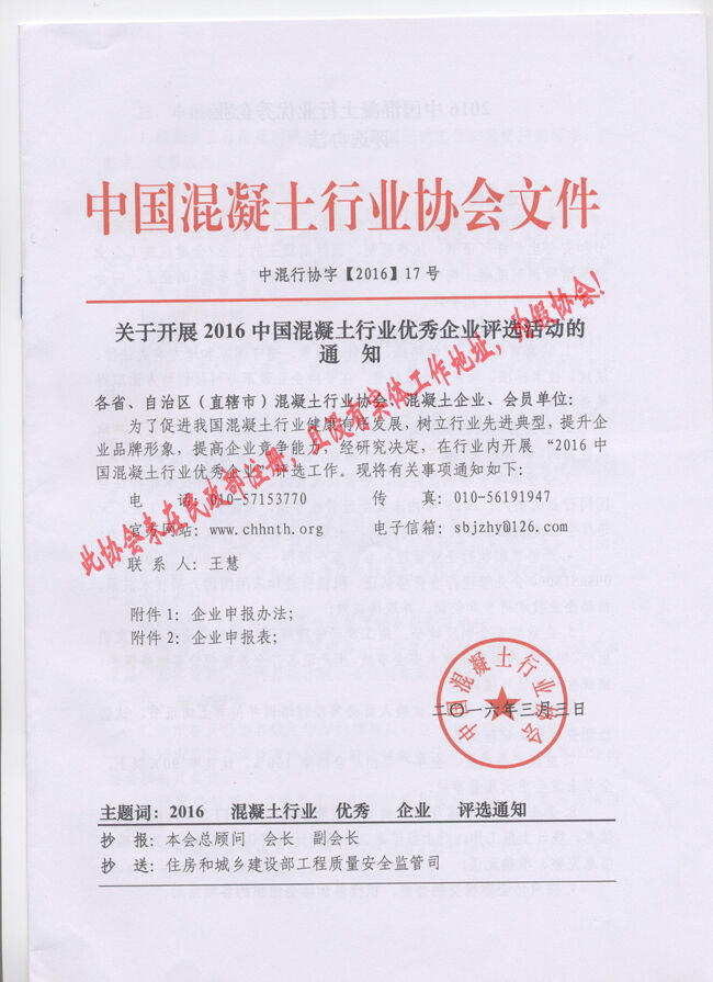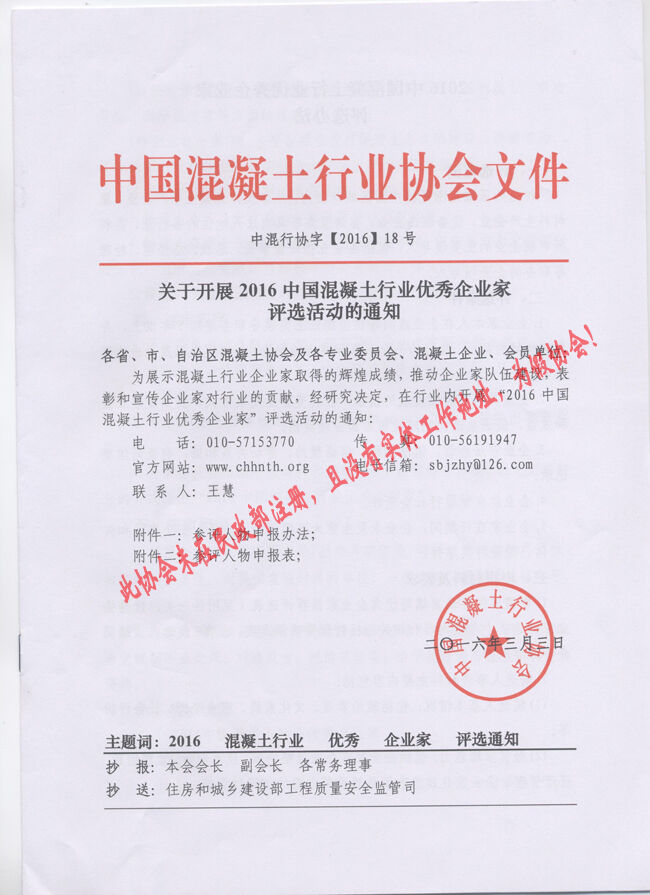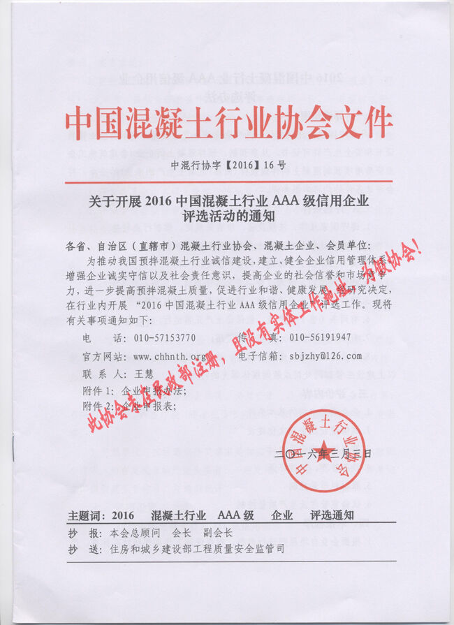 近日,有多家省市協(xié)會(huì)和有關(guān)生產(chǎn)企業(yè)向分會(huì)秘書處反映收到“中國(guó)混凝土行業(yè)協(xié)會(huì)”2016(16、17、18、19、20)文件開展所謂的“中國(guó)混凝土行業(yè)評(píng)選活動(dòng)”的通知。