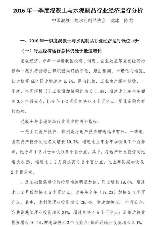 【業(yè)界】2016年一季度混凝土與水泥制品行業(yè)經(jīng)濟(jì)運行分析