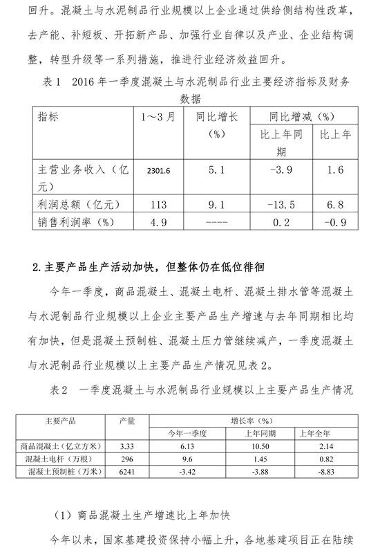 2016年一季度混凝土與水泥制品行業(yè)經(jīng)濟(jì)運行分析