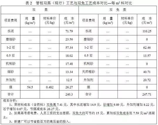 單單從混凝土原材料來看,“雙免”工藝比傳統(tǒng)“雙蒸”工藝高。如果考慮節(jié)省的燃料費(fèi)用和“雙蒸”工藝的電力費(fèi)用、人工工資支出差額,則“雙免”工藝比傳統(tǒng)“雙蒸”工藝可以節(jié)省成本7.59元/m3混凝土,而且完全滿足了環(huán)保要求。下表是成本分析對照表。