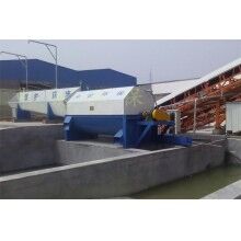 該系統(tǒng)主要由:攪拌車加水清洗裝置,溜槽輸送裝置,砂石漿水分離裝置,和泥漿水后處理裝置組成。混凝土輸送設(shè)備清洗后,將殘余混凝土排入溜槽中,在高壓水流沖擊下,經(jīng)溜槽進(jìn)入砂石分離機(jī),在不斷旋轉(zhuǎn)的分離機(jī)作用下,對(duì)混凝土進(jìn)行充分的清洗,同時(shí)將砂、石進(jìn)行分離,分離后的砂、石在導(dǎo)料葉片的作用下背向流動(dòng),再通過(guò)提升式出料口排出分離機(jī),分別堆放。清洗后的漿水從分離機(jī)的底部排出進(jìn)入沉淀池逐級(jí)沉淀后循環(huán)使用或進(jìn)入攪拌池回收利用。進(jìn)入攪拌池(一般情況2個(gè)攪拌池)的漿水為了防止沉淀凝固,需通過(guò)攪拌器的作用,攪拌器的工作為間歇式。分離出水泥漿在連續(xù)的攪拌器作用下,再通過(guò)高壓污水泵輸送到攪拌樓中待生產(chǎn)計(jì)量再利用。整個(gè)控制系統(tǒng)設(shè)有手動(dòng)和自動(dòng)控制,方便控制設(shè)置,整個(gè)系統(tǒng)運(yùn)行可靠,故障率低,維護(hù)量少等特點(diǎn)。