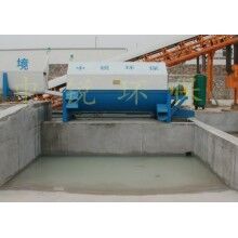 該系統(tǒng)主要由:攪拌車加水清洗裝置,溜槽輸送裝置,砂石漿水分離裝置,和泥漿水后處理裝置組成。混凝土輸送設(shè)備清洗后,將殘余混凝土排入溜槽中,在高壓水流沖擊下,經(jīng)溜槽進(jìn)入砂石分離機(jī),在不斷旋轉(zhuǎn)的分離機(jī)作用下,對(duì)混凝土進(jìn)行充分的清洗,同時(shí)將砂、石進(jìn)行分離,分離后的砂、石在導(dǎo)料葉片的作用下背向流動(dòng),再通過(guò)提升式出料口排出分離機(jī),分別堆放。清洗后的漿水從分離機(jī)的底部排出進(jìn)入沉淀池逐級(jí)沉淀后循環(huán)使用或進(jìn)入攪拌池回收利用。進(jìn)入攪拌池(一般情況2個(gè)攪拌池)的漿水為了防止沉淀凝固,需通過(guò)攪拌器的作用,攪拌器的工作為間歇式。分離出水泥漿在連續(xù)的攪拌器作用下,再通過(guò)高壓污水泵輸送到攪拌樓中待生產(chǎn)計(jì)量再利用。整個(gè)控制系統(tǒng)設(shè)有手動(dòng)和自動(dòng)控制,方便控制設(shè)置,整個(gè)系統(tǒng)運(yùn)行可靠,故障率低,維護(hù)量少等特點(diǎn)。