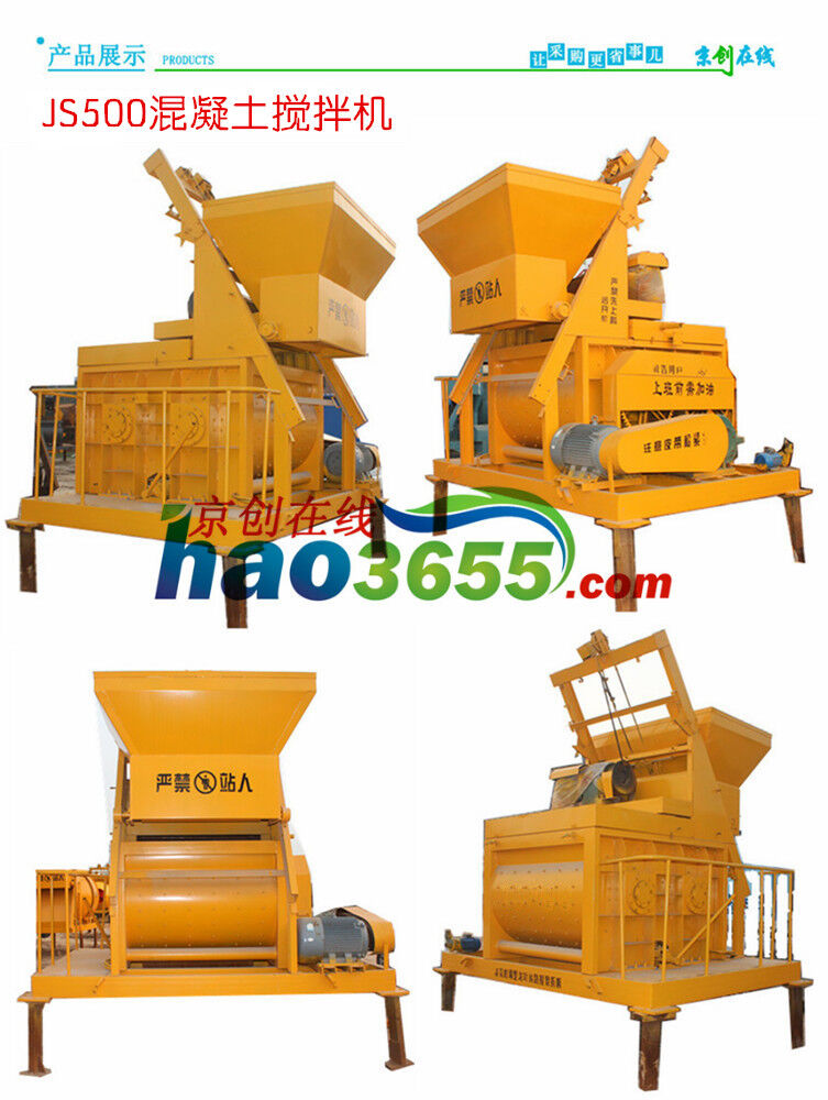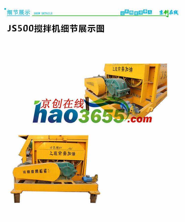 JS500雙臥軸強(qiáng)制式攪拌機(jī) 攪拌系統(tǒng)分別由電機(jī)、皮帶輪、減速箱、齒輪、攪拌裝置、攪拌筒等組成。