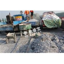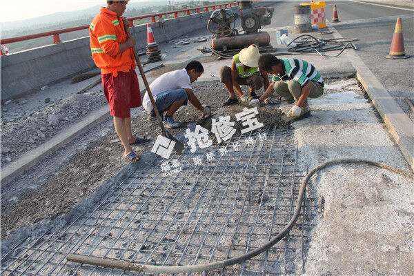 由于時間要求快,應(yīng)采用混凝土特種材料進行搶修,路橋養(yǎng)護特材——搶修寶RT-2,30分鐘速凝,2小時可通行,早期強度高、后期強度不倒縮,粘結(jié)能力強,是治理橋梁路面鋪裝層病害常備的特種建材,采用風(fēng)鎬對鋪裝層病害進行清除,破碎時注意水平方向分離鋪裝層與梁板,不能影響梁板的狀態(tài)和質(zhì)量,對梁板頂要清除整潔,用氣泵或高壓水對梁板頂進行沖洗,不積水不滲漏的情況下,采用搶修寶RT-2特種水泥與標(biāo)準(zhǔn)石子按照要求配比,加水?dāng)嚢瑁杆贊沧⒌讲『Σ课?,抹至與路面齊平時,灑水量水進行收光,指甲掐不動混凝土?xí)r進行養(yǎng)護,2小時后即可通行。避免大面積換板,降低了工程成本。施工無需動用大型機械,對交通安全影響不大。