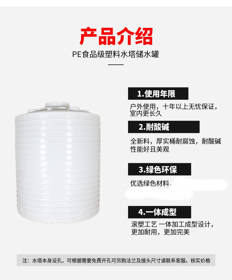 貴州1噸水箱、貴陽儲水箱、貴陽水塔用途:高層建筑二次供水、蓄水水處理凈化設備配套工業(yè)用冷卻水化工制劑、化工原料、各種油品、飲品的儲存、運輸。質(zhì)量保證:7天包換(非人為及不可抗拒的因素),1年免費維修。塑料平底儲罐:主材:進口韓國聚乙塑膠原料。 常用顏色:橙、藍、綠、黑等。性能:一次成型內(nèi)外光滑,具有良好的衛(wèi)生性與抗紫外線能力。撞擊,搞強震,不易老化,不長水藻,易清洗,安裝移動方便。應用范圍:高層建筑二次供水,城鎮(zhèn),農(nóng)村屋頂蓄水,廣泛應用于食品、制藥、賓館、酒店、電子、化工噴織等行業(yè)。 安裝說明及注意事項:1、每只水箱開進水、出水、排污三孔,有特殊要求另定。2、屋頂水箱應放置在受力狀況良好的樓梯開間或平臺上。3、水箱為普力容器,故控制液位應加裝浮球或其它有效控制裝置。
