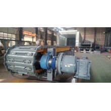 其主要作用是為設(shè)備提供動力及將電機(jī)轉(zhuǎn)速減速至設(shè)備輸送物料需要的轉(zhuǎn)速。傳動部件主要由電機(jī)、齒輪減速箱等配套件組成。電機(jī)和減速箱固定在同一座架上,其間由齒輪聯(lián)軸器聯(lián)接,構(gòu)成一個獨立的部件。