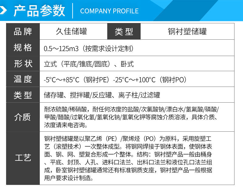 鋼襯塑產(chǎn)品一般由桶身、平底、封頂、人孔、進(jìn)料口法蘭、出料口法蘭和液位孔口法蘭組成,臥室鋼襯塑儲(chǔ)罐通常還有標(biāo)準(zhǔn)鋼質(zhì)支座,鋼襯塑產(chǎn)品一般根據(jù)用戶要求設(shè)計(jì)制造。