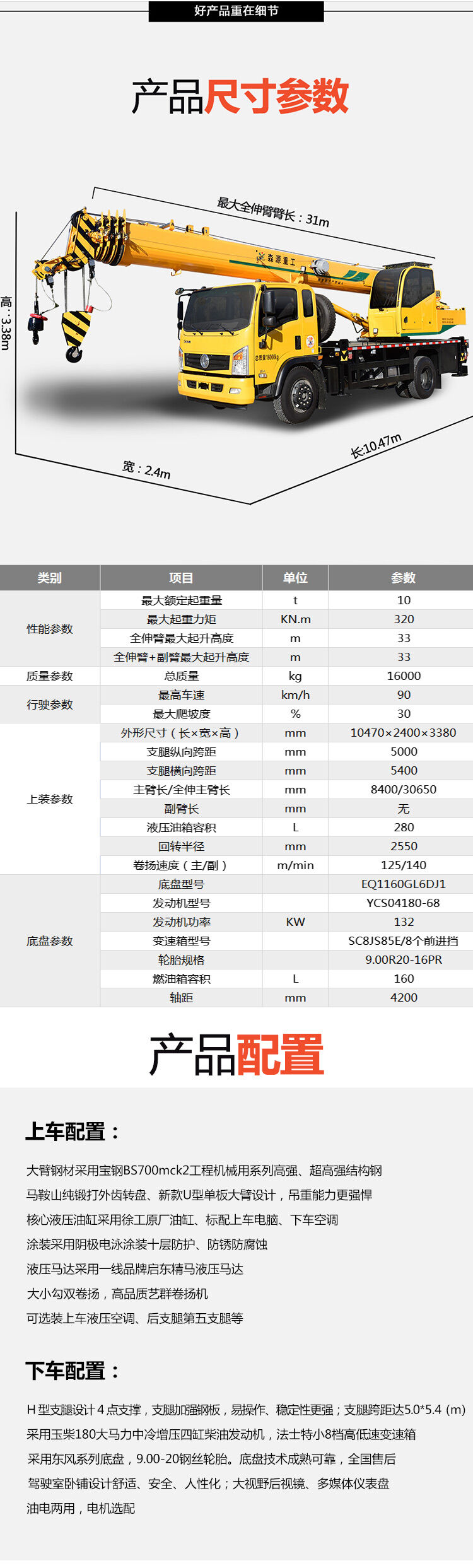 1、新型單板臂頭設(shè)計(jì),全伸臂31米,最大吊高33米