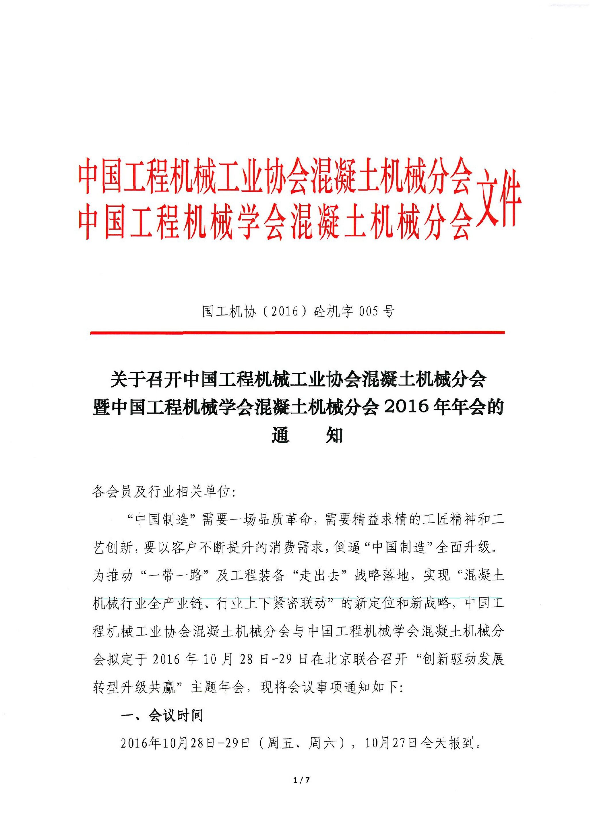 關(guān)于召開中國工程機(jī)械工業(yè)協(xié)會(huì)混凝土機(jī)械分會(huì)暨中國工程機(jī)械學(xué)會(huì)混凝土機(jī)械分會(huì)2016年年會(huì)的通知