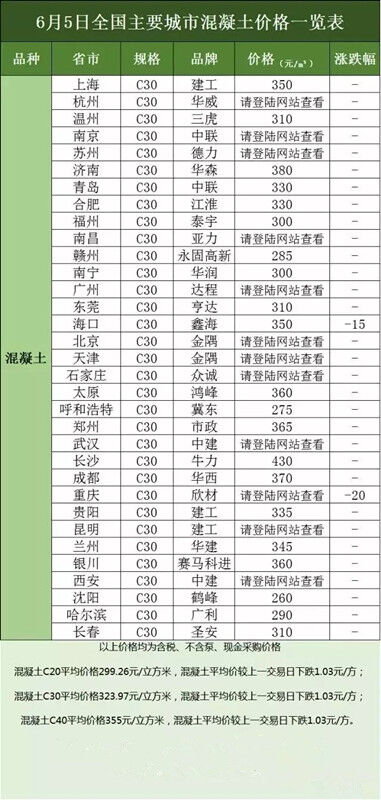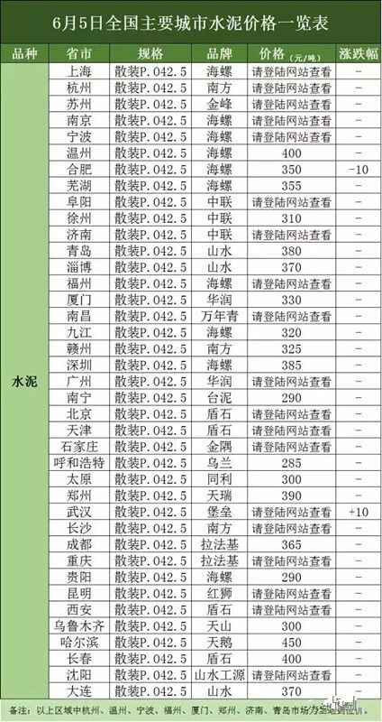 【頭條】6月上旬全國主要城市水泥、混凝土價格表