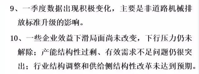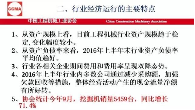我個(gè)人總結(jié),今年的運(yùn)行情況有這樣十個(gè)方面。第一,從整個(gè)全行業(yè)各企業(yè)的資產(chǎn)規(guī)模上看,目前趨于穩(wěn)定,變化幅度很小,不像前兩年振動(dòng)那么大。第二,從資產(chǎn)負(fù)債率來說,現(xiàn)在負(fù)債率是在60%左右,全國的工業(yè)企業(yè)是56%。所以,這個(gè)行業(yè)的資產(chǎn)負(fù)債率目前看也是很好的。這個(gè)需要引起大家的關(guān)注和分析,我們也希望后幾個(gè)月情況可以穩(wěn)定向好。還有自主品牌市場占有率,在國內(nèi)市場還是保持高位,從全行業(yè)來看在90%以上。那么,產(chǎn)業(yè)的集中度又進(jìn)一步地增強(qiáng)了,但有一些企業(yè)挺無助的,出局了,進(jìn)口額下降。今年按照環(huán)保部5號(hào)令,全行業(yè)工程機(jī)械產(chǎn)品實(shí)現(xiàn)了新的標(biāo)準(zhǔn)升級(jí)。整個(gè)產(chǎn)品進(jìn)行了更新?lián)Q代,這個(gè)非常難能可貴。最后是產(chǎn)能結(jié)構(gòu)性過剩,有效需求不足問題仍然突出,行業(yè)結(jié)構(gòu)調(diào)整還有供給側(cè)結(jié)構(gòu)改革遠(yuǎn)遠(yuǎn)沒有達(dá)到預(yù)期。即便是按照現(xiàn)在的挖掘機(jī)銷量5500多臺(tái),就算是6000臺(tái),產(chǎn)能又有多少?一旦市場回暖,一些企業(yè)家還是會(huì)頭腦一熱,這樣大一個(gè)產(chǎn)能釋放出來的產(chǎn)量是什么局面?我們必須保持一個(gè)清醒的頭腦。